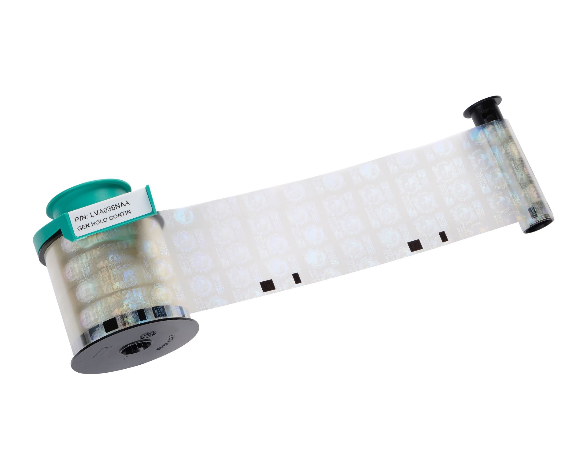 The Evolis LVA036NAA continuous varnish holo ribbon is designed to print a holographic overlay onto cards requiring higher security features such as ID cards, driving licenses or membership cards. With edge-to-edge continuous printing, cards are protected against cloning attempts.