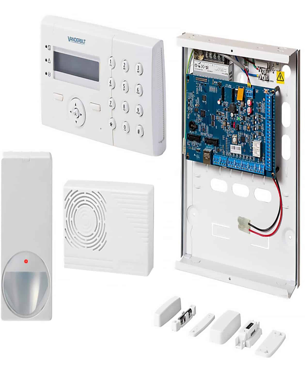 Komplett larmpaket innehållande centralapparat, manöverpanel, IR-detektor, magnetkontakt och siren