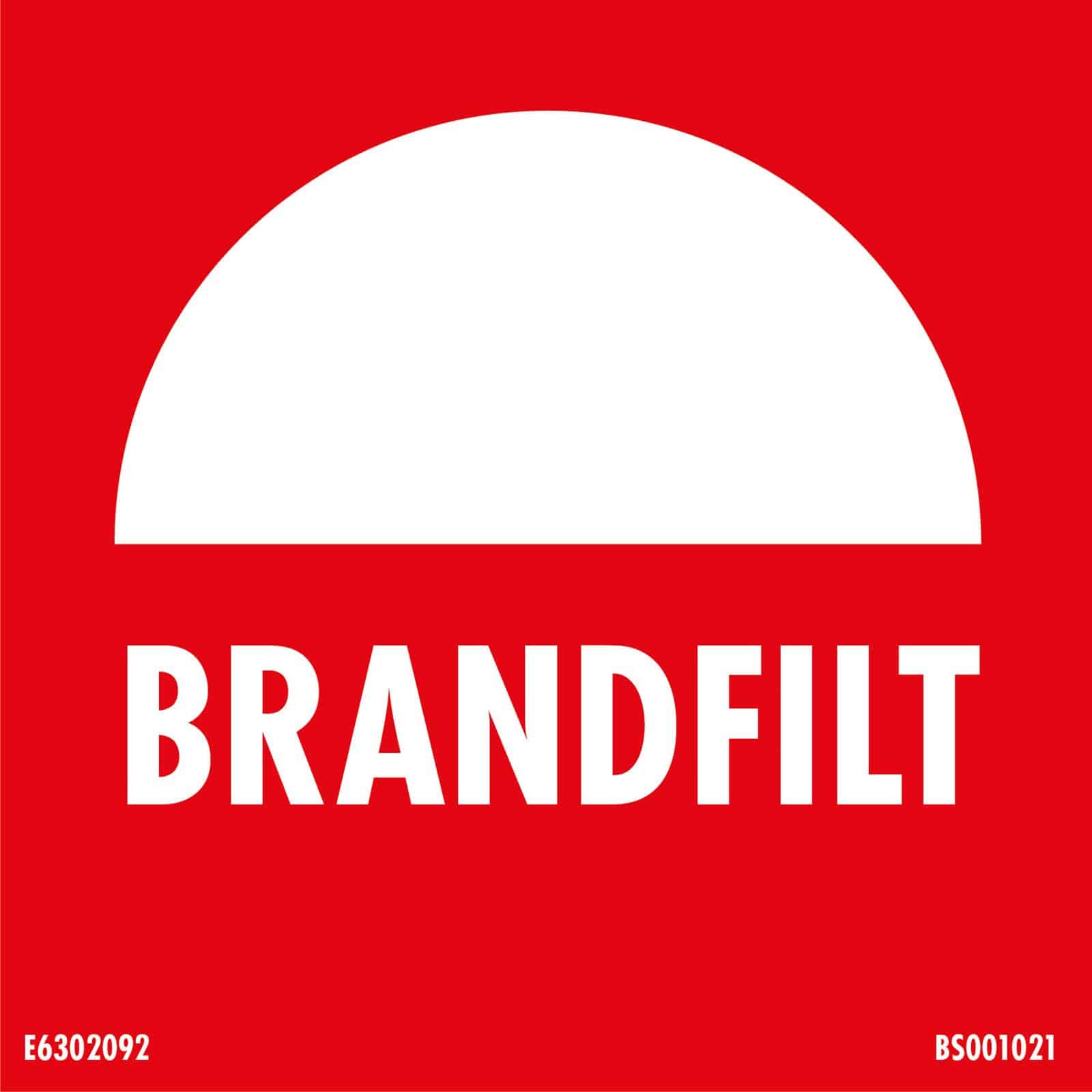 Skylt 150×150 mm tryckt dubbelsidig på PET. Text: BRANDFILT
